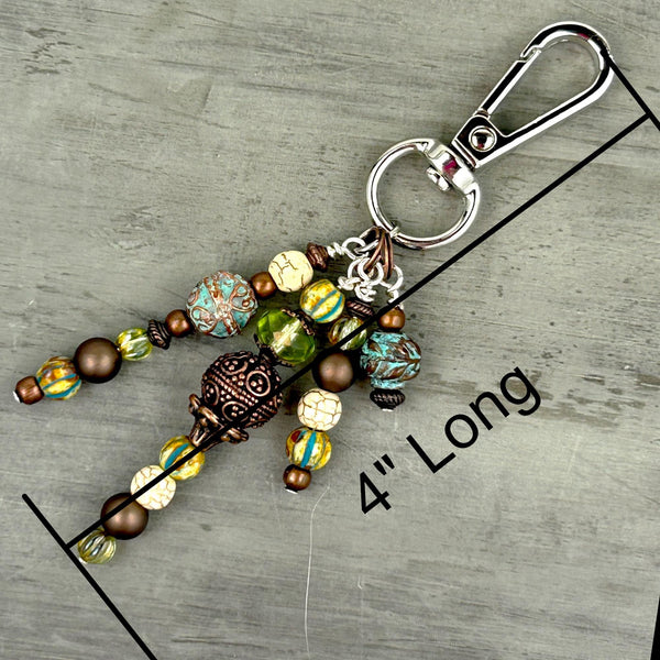 Boho style handmade bag charm, featuring patina Mykonos cast beads, quality Czech beads and gemstones. Beautifully crafted with an artistic touch, perfect for adding style to purses, backpacks, or keychains. Add a unique and vibrant flair to your everyday essentials!