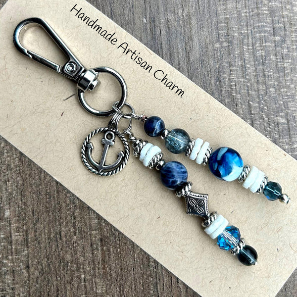 Set sail in style with this handmade artisan beaded charm, featuring a timeless anchor charm, genuine gemstones, and premium-quality beads. Perfect for purses, backpacks, beach bags, or even boating gear, this nautical-inspired accessory adds a touch of seaside elegance to your essentials. Carry the spirit of the ocean wherever you go!