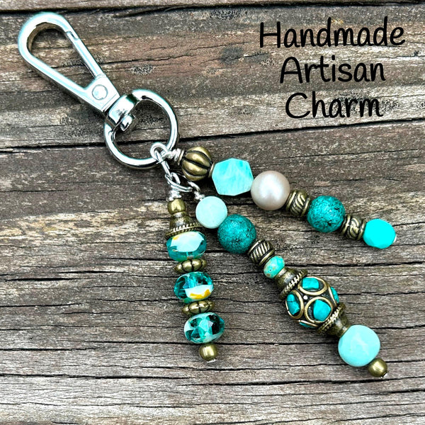 Add calming energy and a splash of color with this handmade Amazonite beaded bag charm. Featuring soothing gemstone beads and boho-style accents, it's perfect for elevating your purse, backpack, luggage, or keychain with artisan charm.