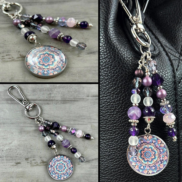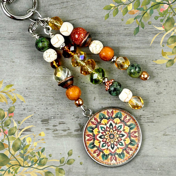 Add a Bohemian Vibe with our Boho Beaded Purse Charm, featuring a stunning mandala charm surrounded by premium crystals and genuine gemstones. Designed to embody balance and harmony, this high-quality charm is perfect for adorning bags or keychains. A unique blend of bohemian elegance and timeless craftsmanship, it adds a touch of beauty and positive energy to any accessory.
